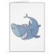 Een cartoon blauwe haai met een grote glimlach en grote tanden.