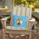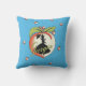 Deze decoratieve kussen in de buitenlucht zijn een levendig blauw met een grote perzik met groene bladeren met een Zuidelijke dame in zwarte silhouet met een hoepelrok en met een parasol met de tekst Georgia. Kleinere perziken zijn verspreid over de kussen.