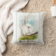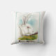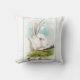 Een grote witte paaskonijn of konijn met roze ogen en lange oren zit in een veld. Afbeelding van een Pasen Kaart met een douane lichtblauwe dubbele grens op een verbeterde witte achtergrond.
