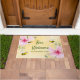 Gele, witte achtergrond met een honingraatpatroon. Versierd met roze tropische bloemen, bloemen, hibiscus en gelukkige hommels. Tekst: Wees welkom. Groene handgeschreven tekst. Sjabloon voor je familienaam. Perfect voor uw zomerhuis!