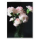 Mooie witte anjerbloemen met roze randen op een zwarte achtergrond.