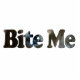 Een leuke gebeeldhouwde magneet met de woorden "Bite Me" en een hondengezicht overlayed.
