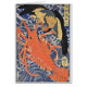Dit is een reproductie van een traditionele Japanse kunstvorm, een houten blok of een ukiyo-e. Afbeelding toont een vogel die naar de kreeft zwaait in een klevende oceaan.