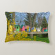 Dit kussen show een rij kleurrijke vogelhuisjes die zonnen in de lentezon. Een geelforsythia struik, een blauwe lucht en groen gras lijsten de rij unieke vogelhuisjes. Show je liefde voor gevederde vrienden en hun vogelhuisjes.