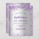 Een meisjesachtige en vrouwelijke 21e (of om het even welke leeftijd) uitnodiging van de verjaardagspartij. Aan de voorkant: een trendy faux zilverachtige achtergrond. Gedemoreerd met donkerpaarse en violette faux glitter, sparkles. Pas een naam, partijdetails aan en voeg deze toe. De naam wordt geschreven met een handgeschreven stijlmanuscript, paarse gekleurde brieven. Achterzijde: faux zilveren achtergrond en faux glitter. 1 blad = 1 uitnodiging