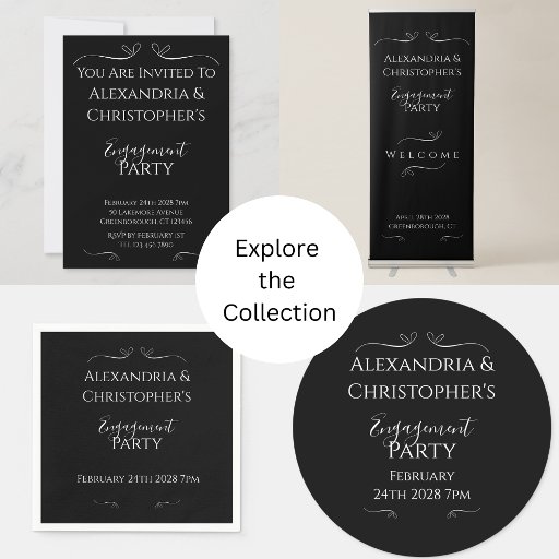 Celebrate your engagement with this elegant black and white design featuring classic script typography. Perfect for a modern or formal party, this chic aesthetic suits any couple. Contact the designer for help with personalization and customization.
