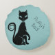 Elegante zwarte kat die poetst met één opgezette poot. Heeft een schattige krulstaart en draagt een fancy kakker. Pas de naam van uw huisdier aan op dit grote ronde kussen bed.