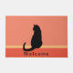 Schaduwen van perzik en sinaasappel, samen met een afbeelding van een silhouet van een zwarte kat die buiten de deur zit. Het woord WELCOME wordt geplaatst onder het afbeelding in moderne zwarte doopvont om gasten welkom te heten.