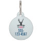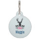Een label voor gezelschapsdieren met een naam en telefoonnummer (op de achterzijde), ontworpen met een zwarte hertenkop met grote geweien. Geometrische lijnen in het gezicht van het hert voegen een creatieve aanraking toe. Kleurrijke roze bloemen en nertsgroene bladeren vormen een bloemendoos onder zijn hoofd. Een schets uit de bergen die tussen de bloemen is geplaatst, vergroot ook het rustige land.