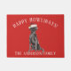 Schattige kerstdeurmat met een Black Lab Dog met een kerstmuts op een feestelijke rode achtergrond.
