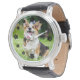 Gepersonaliseerd polshorloge afgedrukt met een foto van uw huisdier. In plaats van nummers worden de uren gemarkeerd met zwarte pootafdrukken.