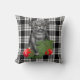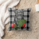 Zwart-wit geplakte achtergrond met een schattige zwarte puppy zittend bij een dennentak met een rood ornament. Een perfect vakantiegeschenk voor de Pug-liefhebber of om uw hondenliefhebbende vakantie op te fleuren