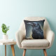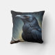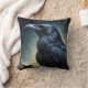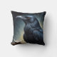 Black Raven Sierkussen. © Dark Heart Desires. Een werpkussen met een zwarte raaf op een tak met wat papier dat zegt Nevermore.
