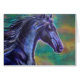 Een zwart paard met de wind in zijn mane, die door dit kleurrijke pastelschilderij loopt.