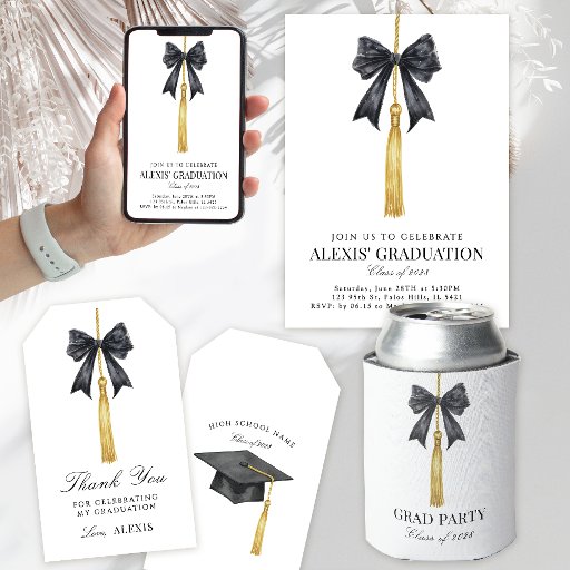 Elegant black and gold Graduation Party invitation featuring grad hat tassel decorated with black waterolor bow in coquette style and a graduation had at the back. Celebrate in Style!
