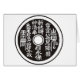 Een zwart-wit afbeelding van een Chinese munt bedekt de voorzijde van het shirt