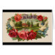 dit blanco wenskaart heeft een afbeelding van drie rode rozen aan de voorkant met twee duiven aan de zijkant en een klein huis in het midden .