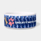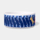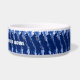 Het originele kunstwerk van ZoeSPEAK op deze luchtig ogende Dog Bowl is een patroon met een sfeer van de kust. De kom is gemaakt in marineblauw en wit, met vormen die eruitzien als waterdruppels in een diagonaal patroon. In het midden van de band staat witte tekst met de tekst "SHELBY'S WATER BOWL". Dit is ingesteld om te personaliseren met de naam van je eigen hond, of verwijderen als je wilt. Links van de naam staat een roze pootafdruk en een lichtbruin hondenbot. Ook deze kunnen naar wens worden verplaatst of verwijderd. Een casual chique hondenlook met gecoördineerd servies voor de mens.