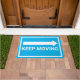 Het humoren verwelkomde mat nabootst het "Bewegende"verkeersteken in helder blauw en wit met een juist richtende pijl, richtend mensen aan uw burenhuis. Ideaal voor mensen die niet van bezoekers houden. om de pijl de andere richting te richten.