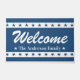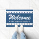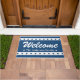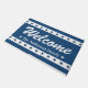 Deze blauw-witte deurmat heeft een rand van patriottische sterren op de boven- en onderkant met 'Welkom' in een groot wit decoratief script. Personaliseer door jouw namen, familienaam of speciale tekst toe te voegen. Perfect voor het zomerseizoen en 4 juli vakantie.