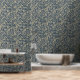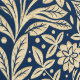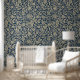 Het is een grafisch bicolor gestileerd waterverf bloemmotief van faux goudbloemen en bladeren op een diep donkerblauwe achtergrond.