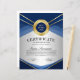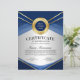 Professioneel blauw en goud verticaal certificaat van waardering flyer sjabloon met een grijze verloop achtergrond en een blauwe en glanzende gouden medaille met een blad eromheen. Perfect voor scholen, bedrijven, kerken en meer! Pas het certificaat naar wens aan.