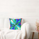 Een bloem abstract in tinten blauw en groen op een achtergrond van rood. Het ontwerp wordt horizontaal getransponeerd op tegengestelde zijden voor bijpassende looks. Het basisbloemontwerp is vloeiend en als geschilderd, met wervelende elementen die penseelstreken of waterverf suggereren. De algehele look is levendig en vrolijk, het projecteren van een ontspannen kwaliteit voor de woonkamer, slaapkamer, werkruimte, terras of patio decor. Er is veel decoratiepotentieel, omdat het ontwerp past in tal van stijlen, van boerderijstijl tot ranchstijl, van voorstedelijk tot rustieke hacienda tot urban loft of trendy bohemien tot / retro, hetzij als onderdeel van een thema of contrasterend accentstuk.
