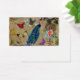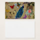 Een blauwgroene en gele koninklijke kleurrijke pauw met schattige roze bruine vlinder en afbeeldingen. Een stijl op bruin schrift papier textuur achtergrond. Het perfecte cadeau-idee voor haar, het dierenvriend of wie dan ook bij elke gelegenheid.