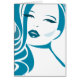 Levendig, retro girly thema in blauwe cyaan en witte kleuren. Een mooie, sensuele vrouw in haar gezicht en nek. Fun, retro tekening.