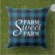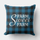 Unieke, elegante en decoratieve kussen op boerenstijl met schattige Boerderij Sweet Boerderij citaat tekst, op een klastig blauw en zwart gekleurd Buffalo Lumberjack tartan controleert patroonontwerp.