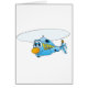 Een blauwe cartoon helikopter vliegt de vriendelijke lucht in.