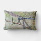 Langwerpige kussen met schilderende illustratie van een blauwe daserlibel die op een pruik is aangebracht