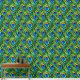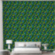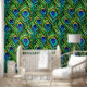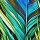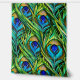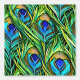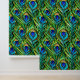 Een achtergrondpatroon van pauwenveren in diepe tinten groen en blauw.