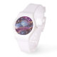 Een horloge met een abstract ontwerp met blauwe en paarse lagen met faux gouden folie linten ertussen.