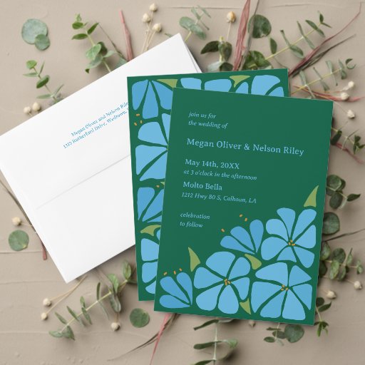 Grote, gedurfde, hemelsblauwe gestileerde bloem op een rijke jager groen.Gaat met Blue Groovy Flower Pattern Wedding Invitation.