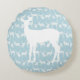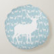 Dit hertenontwerp rond kussen is ideaal voor iedereen die houdt van herten, dieren, wilde dieren en leuke design! Beschikt over verschillende kleine rustieke witte herten silhouetten op een achtergrond van lichtblauw met een groot wit silhouet doet op de voorkant, bok op de rug. Dit hertenkussen is perfect voor de woonkamer, het hol, de familiekamer, de familiecabine op het meer, en natuurlijk maakt het een groot geschenk.
