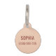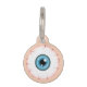 Destei's cartoon-illustratie van een griezelige bloeddoorlopen oogbol met een blauwe iris. Aan de andere kant zijn er twee personaliseerbare tekstgebieden waar de ene ideaal is voor de naam van het huisdier, terwijl de andere kan worden gebruikt voor het telefoonnummer van de eigenaar.