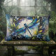 Een lichtgevende blauwe libel zweeft in het midden van een dromerige waterverfcompositie, omringd door weelderige botanicals, zachte veren en inktachtige spetters van indigoblauw, turquoise en paars. De gelaagde texturen en geschilderde druppels creëren een speelse boho-esthetiek die zowel betoverend als sereen aanvoelt. Juweelgekleurde vleugels glinsteren tegen een sombere abstracte achtergrond en combineren cottagecore-charme met moderne volksartistieke elementen. Deze visuele kunst ontlokt transformatie, lichtheid en een stille verbinding met de magie van de natuur. Door AI gegenereerde kunst.