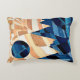Accentkussen met gedurfde complementaire kleuren en interessante vormen en texturen; een abstract kunstwerk dat een blauwmaan en bergen tegen een vurige oranje lucht weergeeft.