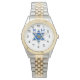 Zowel mannelijke als vrouwen polsen over de hele wereld hebben hun "Thumbs Up" gegeven aan dit prachtige horloge ontwerp! Het witte gezicht, de heldere bezel en de tweekleurige band is een trending look die nog unieker en specialer is gemaakt door de blauwe lapis lazuli geïnspireerde Magen David gecentreerd op het gezicht, zwarte numerieke uur markers die de look van het Hebreeuws nabootsen, en aangepaste tekstvelden voor de initialen van de drager.