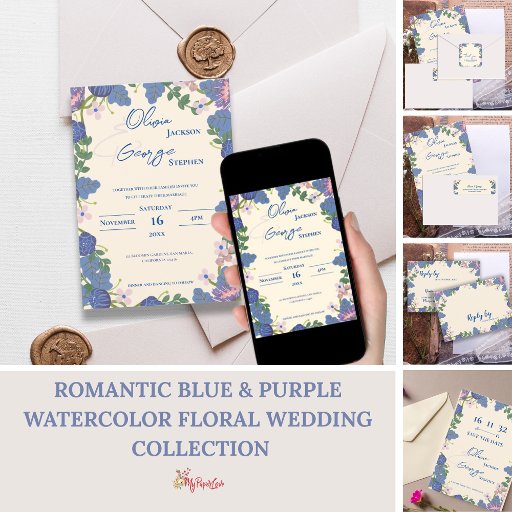 Romantic Blue & Purple Watercolor Floral WeddingOntworpen door Mypaperlove Designs