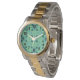 Het horloge van deze mannen heeft een modern vormgegeven van pijlen in twee tinten blauw op een gebied van zeebrasem groen.