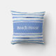 Blauwe polka stip en blauwe en witte strepe zeepkussen met waterverf met strandhuis.