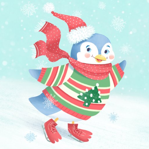Een winterse feestelijke pinguïn glijdt vrolijk over het ijs terwijl delicate sneeuwvlokken tegen een mintyblauwe lucht herfsten! Originele illustratie door Noël Snow.