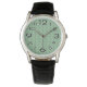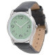 Dit horloge van mannen heeft een kunstdecoontwerp van blauwe en paarse halve cirkels verbinden met lijnen op een gebied van lichtgroen.