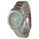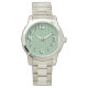 Dit vrouwenhorloge heeft een kunstdecoontwerp van blauwe en paarse halve cirkels die verbonden zijn met lijnen op een lichtgroen veld.