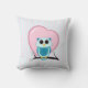 Een Valentijnsdag monochromatische blauwgroen blauwe uil op een vertakking met een roze hartvormige maan en een roze en blauwgroen gestreepte achtergrond.