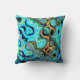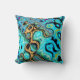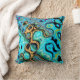 Een helder blauwgroen werpkussen, doorspekt met gouden en zwarte wervelingen en rimpelingen.