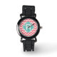Verander het initiaal in elke gewenste tekst en maak van dit horloge een zeer persoonlijk cadeau. Achtergrond heeft koraalkleurige zigzag chevron strepen, en het centrum is licht turquoise of blauwgroen. Witte details. Van Scarebaby Design, ondersteund door de Zazzle garantie.