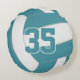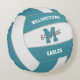 Dit sportieve team kleuren volleyball round gooit kussens met het afbeelding van een realistisch uitziend blauwgroen en wit volleybal waarop je de naam van de speler, de monogram of de varsity letter, het team en de mascot naam op de voorkant en het jersey nummer op de achterkant kunt aanpassen - door katz_d_zynes